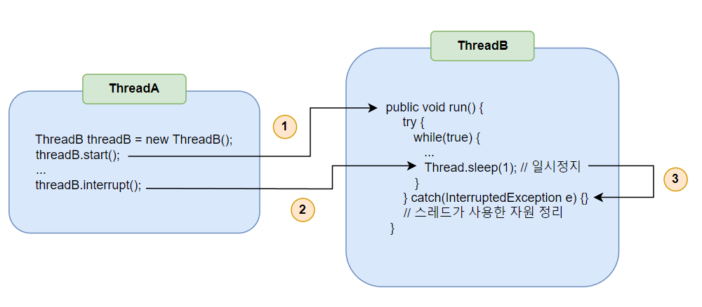 interrupt() 메소드는 스레드가 일시 정지 상태에 있을 때 InterruptException 예외를 발생시키는 역할을 한다. 이것을 이용하면 run() 메소드를 정상 종료시킬 수 있다. 예를 들어 다음 그림과 같이 ThreadA가 ThreadB를 생성해서 start() 메소드로 ThreadB를 실행했다고 가정해보자.